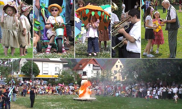 In den Eberbacher Kindergärten hatte man sich gut auf den Umzug vorbereitet und Kostüme ausgedacht. So gab es ganze Gruppen von Hutzelmännchen, Blumenkindern und Trägern bunt geschmückter Sonnenschirme. Mit dabei waren auch wieder Helfer vom Pfadfinderstamm Silberreiher, die die großen Sommer- und Winterfiguren zogen.
