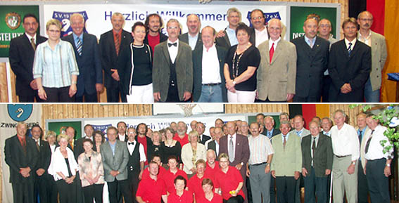 Festbankett mit Rückblick und vielen Ehrungen Viele Ehrungen gab es bei dem Festbankett anlässlich des 50jährigen Bestehens des SV Zwingenberg. Unser oberes Foto zeigen die vom Fußball- und Tischtennisverband, sowie vom Main-Neckar-Turngau geehrten Zwingenberger Sportler zusammen mit Bürgermeister Peter Kirchesch (3.v.l.), den Vertretern der Sportverbände und der Vorstandschaft des SV Zwingenberg. Das untere Foto zeigt die vom SV Zwingenberg geehrten Mitglieder mit der Vorstandschaft. (Fotos: Baumgartner)