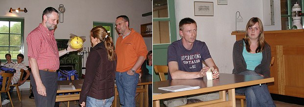 Thomas Gerboth und Nadine Brose in Vorstand gewählt Im Namen des Handballkreises Heidelberg übergab Uwe Weis (l.) drei Bälle für SGH-Teams (l.). Rechts die neuen Vorstandsmitglieder Thomas Gerboth und Nadine Brose (Fotos:Claussen)(jc) Turnusmäßig versammelte sich die Spielgemeinschaft Handball Waldbrunn/Eberbach (SGH) am gestrigen Abend zur jährlichen Vollversammlung. Die SGH bestreitet den Spielbetrieb der Jugendmannschaften und der Damenmannschaft der HG Eberbach und der SG Waldbrunn. So waren ein Großteil der Versammlungsteilnehmer Kinder und Jugendliche mit Betreuern und Eltern. Uwe Weis, 1. Vorsitzender, konnte im fast vollbesetzten Vereinsheim der Handballgesellschaft Eberbach in seinem Bericht dem abgelaufenen Vereinsjahr fast nur Positives abgewinnen, zumal mit den Staffelmeisterschaften der Damenmannschaft und der weiblichen C-Jugend zwei Titel nach Eberbach und Waldbrunn gingen. Auch das sportliche Abschneiden der anderen Mannschaften war größtenteils erfreulich. Beispielsweise konnte die männliche D-Jugend mit einem 4. Platz in der Leistungsklasse an den Qualifikationsspielen für die Badenliga teilnehmen. Negativ hängen blieben nur die Umstände im Zusammenhang mit der Entlassung des Trainers der Damenmannschaft, Klaus Fabig, der vom Team „gefeuert“ wurde, ohne dass der Vorstand sich ausreichend einbezogen fühlte.