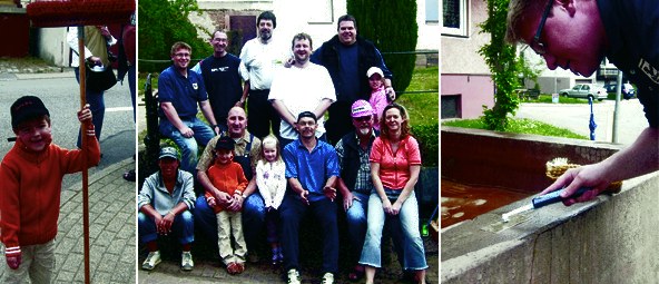 Brunnen in Neckarwimmersbach gereinigt Links: Auch die Jugend übt sich schon als "Arbeiterdenkmal", rechts: Technisches Gerät zur Reinigung, Mitte: Das Reinigungsteam. (Fotos:privat)(hr) (bw) Der Kuckucksbrunnen im Eberbacher Stadtteil Neckarwimmersbach wurde am 5. Mai von seinen beiden Paten, der KG Kuckuck und der KG Urmel, "heimgesucht". Mit Schrubbern, Besen, Harken und Eimern wurde der Winterdreck entfernt. Ein schlagkräftiges Team aus beiden Lagern, unter der "Uffsicht" von Dieter Müller (KGK) und Bernhard Walter (KGU), reinigte diesen geschichtsträchtigen Brunnen. Markus Scheurich zauberte ein hochtechnisches Hilfsmittel aus seiner Hosentasche: Unter Zuhilfenahme einer elektrischen Zahnbürste wurde das Messingschild, das auf die Paten hinweist, auf Hochglanz poliert. Nach getaner Arbeit wurde gemeinschaftlich auch dem "Urmel-Brunnen" (Alter Schulhaus-Brunnen) der nur einen Steinwurf entfernt liegt, zu Leibe gerückt. Für die Frauen und Männer der KG Kuckuck eine Selbstverständlichkeit, auch hier zu helfen, obwohl die Patenschaft bei diesem Brunnen "nur" bei der KG Urmel und ihrem Präsidenten Joachim Schwab liegt - wieder ein Beweis für die Zusammenarbeit der Vereine in Eberbach.
