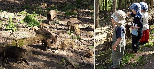 Frischlings-Nachwuchs im Holdergrund (Fotos: StVE)(bro) (stve) Die begeisterten Worte: "Sweine, Sweine" hallen zurzeit im Wald, wenn kleine Kinder die Frischlinge im Wildschweingehege entdecken. Ungefähr 15 der gestreiften Nachwuchswappentiere sind seit drei Wochen im Wildgehege im Holdergrund unterwegs und halten ihre Artgenossen auf Trab.