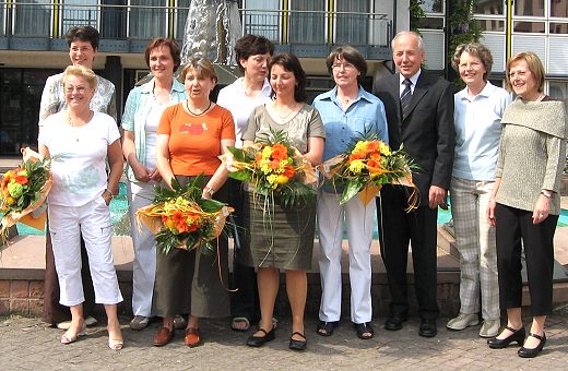 Ehrungen bei der Sozialstation Die Geehrten Ilse Krauth, Christina Münch, Barbara Hackl, Christiane Koch und Ingeborg Riedinger (mit Blumen, v.l.) mit Wolfgang Kleeberger, Pfarrerin Sabine König (links), Dr. Ingrid Ebschner (2.v.r.) und Mitarbeiterinnen der Sozialstation. (Foto:privat)(hr) Die Kirchliche Sozialstation Eberbach konnte kürzlich drei hauptamtliche Mitarbeiterinnen und zwei Mitarbeiterinnen der Nachbarschaftshilfe ehren.