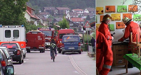 Dicke Luft im Gruppenraum - Rettungskräfte suchen nach der Ursache (Fotos:C.Richter)(cr) Besonnen reagierten heute Morgen die Erzieherinnen der Kindertagesstätte St. Josef in der Waldstraße. Als sie kurz nach 7 Uhr beim Öffnen eines Gruppenraumes im Erdgeschoss einen beißenden Geruch nach Ammoniak wahrnahmen, durfte kein Kind in die Gruppe. Die Fenster wurden geöffnet und die Feuerwehr verständigt. Die rückte mit drei Fahrzeugen an, ein DRK-Rettungswagen und die Polizei kamen gleich mit.
