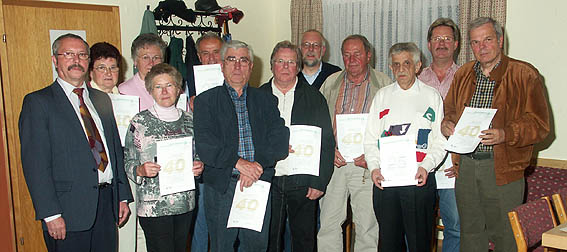 Da es zum Punkt Aussprache über die Berichte der Vorstandschaft keine Wortmeldungen gab, konnte Gemeinschaftsleiter Günter Gepperth Ehrungen seitens des Verbandes vornehmen. So wurden Peter Böllmann, Hans Geppeth, Sieglinde Haas, Kurt Krämer, Wolfgang Söhner und Christian Steiner mit der bronzenen Ehrennadel für 10jährige Mitgliedschaft im Verband Wohneigentum Baden-Württemberg ausgezeichnet. Für 25jährige Mitgliedschaft wurden Günter Beisel, Klaus Schell und Fritz Schork ausgezeichnet. Die Goldene Ehrennadel des Verbandes für 40hährige Mitgliedschaft erhielten Käthe Angstmann, Alfred Auer, Norbert Eichhorn, Inge Mader, Alfons Müller, Anneliese Noe, Ernst Rohm und Anni Vogel.