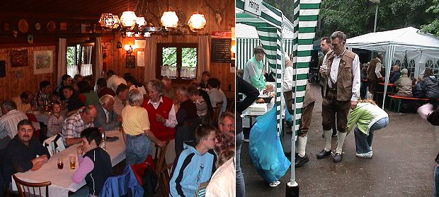 Diesmal hatten sich die Organisatoren kurzfristig entschlossen, das Fest in die vereinseigene Concordia-Hütte zu verlegen, um nicht ganz "abzusaufen". So konnte man gemütlich im Trockenen sitzen. Aber auch die Freunde frischer Waldluft kamen auf ihre Kosten und durften draußen unter wasserdichten Pavillons Platz nehmen. Dort spielten auch die "Kleinen Egerländer" zur Unterhaltung.