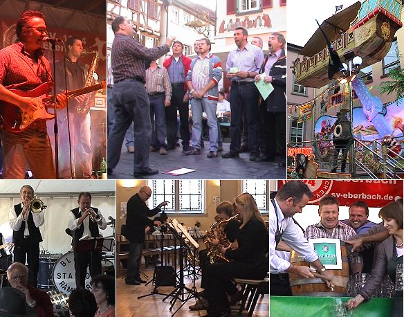 Gelungener Auftakt zum Frühlingsfest Mit dem Frühlingsliedersingen (o. Mitte) startete das Fest heute Abend. Unten rechts der Fassanstich durch Bürgermeister Bernhard Martin mit der Landtagsabgeordneten Elke Brunnemer. Musik gab es heute u.a. von "Simplex" (o.l.), den "Blues Station Ramblers" (u.l.) und der Musikschul-Big-Band (u. Mitte). (Fotos:Richter)(hr) Ein geballtes Programm aus Musik und Unterhaltung bietet diesmal wieder das Eberbacher Frühlingsfest, das heute Abend mit dem traditionellen Frühlingsliedersingen am Alten Markt eröffnet wurde. Der MGV Igelsbach und der MGV Sängerlust Rockenau stimmten, begleitet von der Katholischen Pfarrkapelle, Frühlingsweisen an und luden die Festgäste zum Mitsingen ein.
