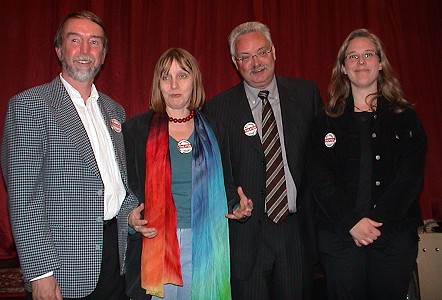 Annette Schiffmann vom städtischen Theater Heidelberg war deshalb eigens zu der Vorstellung am 8. Mai gekommen und dankte der Theater-AG für ihre Unterstützung. Unser BIld zeigt Annette Schiffmann (2.v.l.) mit Eberhard Höhn (l.) und Jutta Gewahl, die die Theater-AG betreuen, sowie HSG-Schulleiter Helmut Schultz.