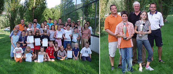 Yannick Wörtz und Ann Kathrin Sigmund gewinnen erneut den Pokal Links: Die Wettkampfschwimmer des TVE, rechts: Die Pokalsieger Yannick Wörtz und Ann-Kathrin Sigmund mit den Abteilungsleitern Andreas Kohler (li.) und Michael Sigmund und Vorstand Wolfgang Grimme (Mitte). (Fotos: privat)