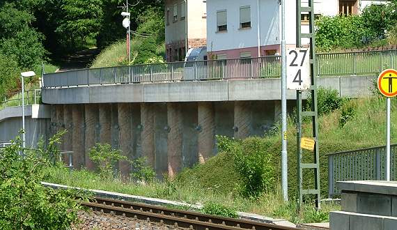 Bohrpfahlwand soll schöner werden (Foto:Richter)(hr) Unterhalb des Birkenweges in Lindach befindet sich im Anschluss an den Sichtbeton der Bahnunterführung eine Bohrpfahlwand. Aus ästhetischen Gründen soll sie demnächst verkleidet werden. An dem "Wie" dieser Verkleidung schieden sich gestern Abend im Gemeinderat die Geister.