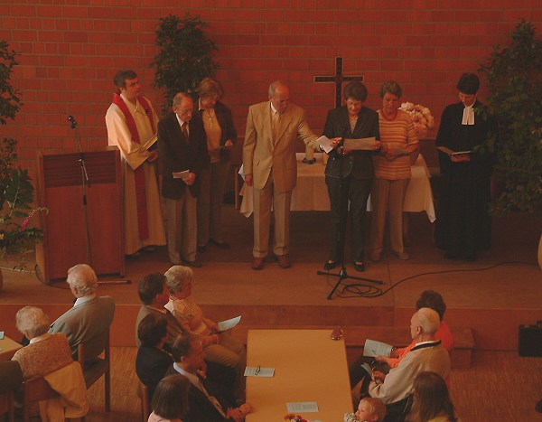 Ökumenischer Pfingstgottesdienst in der Regenvariante (Foto:Wörner)(tw) Wegen des Regenwetters musste der Ökumenische Gottesdienst, den die evangelischen und katholischen Gemeinden Eberbachs an Pfingsten traditionell auf dem Leopoldsplatz feiern, heute im evangelischen Gemeindehaus stattfinden. Pfarrerin Sabine König, die kurzfristig für Dekanin Hiltrud Schneider-Cimbal eingesprungen war und Pfarrer Mathias Stößer gestalteten zusammen mit zahlreichen Gläubigen einen feierlichen Gottesdienst. Die musikalische Unterstützung oblag in diesem Jahr der Katholischen Pfarrkapelle unter der Leitung von Gustav Rumstadt. Der Erlös der Kollekte soll der Ökumenischen Gemeindearbeit in Eberbach zugute kommen.