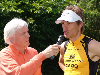 Timo Bracht läuft Runde für Runde für die Raucherprävention Bracht im Interview mit Dieter Kürten (Foto: Veranstalter)