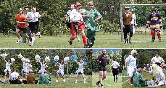 Urmel und Kuckucke trennen sich 5 1/2 zu 5 1/2 Tore (Fotos:Claussen)(jc) (bw) Das mit viel Spannung erwartete Spitzensspiel der karnevalistischen Fussballsaison im Neckarwimmersbacher "Maracana-Dreiecksstadion" endete mit einem Unentschieden. Die zahlreichen Zuschauer sahen bereits beim Einlaufen das jede Mannschaft nur die Besten aus Ihren Reihen in dieses Duell schickten. Nach der obligatorischen Wimpelübergabe und der Nationalhymne (Badner Lied) begann das Duell des Jahres. Mit vielen, fast unglaublichen und raffinierten Spielzügen stand es beim Abpfiff 5 1/2 zu 5 1/2 Tore. Jedes der gefallenen 11 Tore kam man unumstritten im Bereich "Tor des Monats" einordnen. Auf der Seite der KG-Kuckuck stand Dirk Müller im Tor, und auch dieser war es der den Halbentreffer mit einem Abschlag direkt also ein "Hole in One" im Netz der Urmel zappeln ließ. Die von Oberhauptschiedsrichter "Lungo" verpfiffene Partie verlief weitgehend fair. Abgesehen von kleinen Remplern und Fußstellern blieben, auch dank der erstklassigen Versorgung der beiden Krankenschwestern Monika und Angelika, Verletzungen aus. Heute noch ranken sich Gerüchte mit welchem Zaubermittel diese beiden Feen in weiß wohl die am bodenliegenden Spieler so schnell wieder auf die Beine gebracht haben. Angelika war es auch die zum Ende des Spieles am 16er lauernd mit einer direkt Annahme das entscheidende Halbetor für die Urmel erzielte. Eine der schillernsten Figuren des Fussballs des letzten Jahrhunderts konnten die Urmel verpflichten. Kein geringerer als Diego Armando Maradona (Wolfgang Walter) zauberte nicht nur mit Strohhut und Zigarre am Ball sondern zog sich unter Zuhilfenahme eines Strohhalmes ab und an auch mal an den weissen Spielfeldbegrenzungen eine "Line". Zum Abschluß zeigten die sehr ansehlichen Chearleaders der KG Kuckuck noch mal das sie nicht nur auf der Bühne sondern auch auf dem Grün tänzerisch ihr Publikum begeistern können.