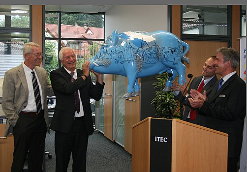 Schwein gehabt Ernst Leitritz - Aufsichtsrat der Bank, Gerhart Grüber, Sebastian Grüber, Hubertus Droste - Vorstandsvorsitzender der Volksbank Biberach (v.l.) und der Eberbacher Eber. (Foto:privat)(bro) (gg) Ein Exemplar aus der Initiative "101 Eber für einen guten Zweck" hat einen Platz im Süden des Landes in Ochsenhausen bei Memmingen gefunden. Bei der am 15. Juni erfolgten Einweihung der umgebauten und erweiterten Geschäftsstelle der Volksbank Biberach eG übergaben Gerhart und Sebastian Grüber von Grüber Projekt- und Facility Management statt des obligatorischen Schlüssels einen in den Farben ihrer Heimatstadt gestalteten Eber, damit "Aufsichtsrat, Vorstand und Mitarbeiter der Bank ihren Projektbetreuer in guter Erinnerung behalten".