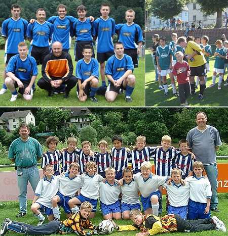 1. Lumber-Cup mit tollem Fußball bei Regenwetter-Bei den Jugendturnieren spielte der Wettergott mit Junge Union, Sieger beim Lumber-Cup (oben links), D-Jugend Sieger SG Waldmichelbach (oben rechts) und die siegreiche E-Jugend des VfB Eberbach (gestreifte Trikots) zusammen mit der E-Jugend II des VfB die den 4. Platz belegte. (Fotos: FC Hirschhorn/Wörner)(tw) (ka) Neun Freizeitmannschaften, mit teilweise illustren Namen meldeten sich zum 1. Lumber-Cup, dem von Thorsten König organisierten Fußballturnier am vergangenen Samstag an. Bei schlechtem Wetter und zwischenzeitlichen Platzregen, zeigten die Akteure aber guten Fußball auf Kleinfeld. In Gruppe 1 spielten die Mutzelmänner; Sportfreunde Brombach; Junge Union; FC Stiege und hiho-do-del-di-dai. Das Halbfinale erreichten hierbei hiho-do-del-di-dai und die Junge Union. Vamos HTV; Supporters Hirschhorn; Zipfelklatscher und Mongo Batchas spielten in der 2. Gruppe die Halbfinalisten aus, das Vamos HTV und die Mongo Batchas erreichten. Die Letztgenannten schlugen überraschend die Mannschaft hiho-do-del-di-dai mit 4:3 Toren und standen als erster Endspielteilnehmer fest. Im zweiten Halbfinale setzte sich die Junge Union knapp mit 3:2 Toren gegen Vamos HTV durch. Somit spielten hiho-do-del-di-dai und Vamos HTV das kleine Endspiel aus, bei dem hiho-do-del-di-dai mit 1:0 als Sieger vom Platz ging. In einem spannenden Endspiel schlug die Junge Union (unser Bild) die Mongo Batchas mit 2:0 und gewannen damit den erstmals ausgetragenen Lumber-Cup.