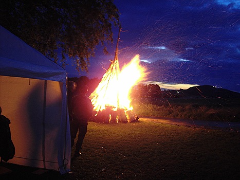 Schon eine paar Tage vorher wurde von den Mitgliedern große Mengen trockenes Holz für das imposante Feuer, das mit Einbruch der Dunkelheit angezündet wurde, was an diesem besonderen Tag so gegen 22 Uhr der Fall war, aufgestellt. Jung und Alt trafen sich dann am Abend an der Hindenburgsäule. Grillgut und Getränke stellte die RK gegen ein geringes Entgelt zur Verfügung. Man saß zusammen, genoss die laue Abendluft, hielt ein Schwätzchen oder begeisterte sich für den grandiosen Ausblick hinüber zum Katzenbuckel.