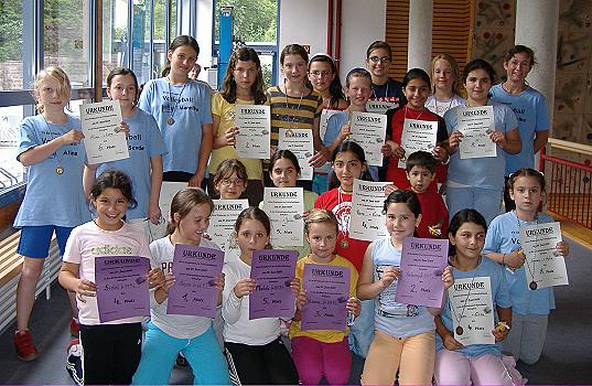(bro) (tg) Am Mittwoch, 27. Juni, fand das diesjährige Heimturnier der Volleyball-Mädchen bis elf Jahre in der HSG-Sporthalle statt. Die Spielpaare wurden ausgelost, und im Spielmodus "jeder gegen jeden" wurden alle Bälle 90 Minuten lang heiß umkämpft. Angefeuert von Eltern und Geschwistern standen bald die einzelnen Platzierungen fest. Auch die erst kürzlich dazugekommenen "Neulinge" konnten schon Punkte sammeln. Bevor alle Mädchen mit ihrer Urkunde stolz nach Hause gingen, stärkte man sich noch an dem Büfett, das die Elten reichlich bestückt hatten.