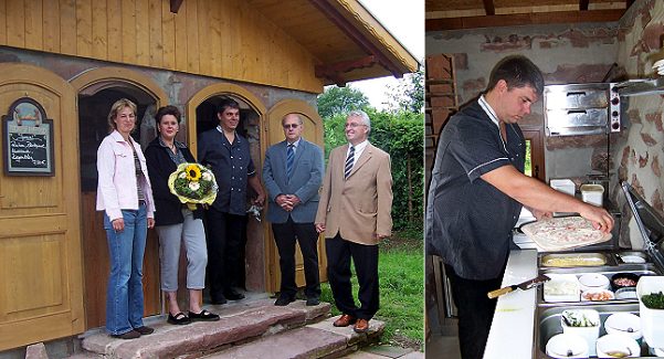 Elsässer Flammkuchen nach traditionellem Rezept Links: Bürgermeister Klaus Schölch (r.), Ortsvorsteher Karl-Heinz Wetterauer (2.v.r.) und Anke Lenz (li) von der Tourist-Information der Gemeinde Waldbrunn gratulieren Corinna Hartmann und Kai Bachert zum Flammkuchenhaus.Rechts: Im Flammkuchenhaus belegt Kai Bachert den dünn ausgerollten Teig nach Wunsch der Gäste mit verschiedenen Zutaten. (Fotos: privat)