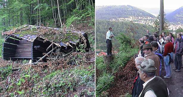 10.000 Festmeter Sturmholz nach Juni-Gewitter Am Itterberghang erläuterte Siegfried Riedl den Teilnehmern des gestrigen Waldbeganges die Vorgehensweise der Stadtförsterei bei der Aufarbeitung des Sturmholzes. Links die zerstörte Schutzhütte an der "Hiobskehre". (Fotos:Richter)(hr) Über die Schäden nach dem lokalen Unwetter in Eberbach am 9. Juni informierte die Forstverwaltung dieser Tage den Gemeinderat. Siegfried Riedl, Leiter der Stadtförsterei berichtete in der Gemeinderatssitzung am vergangenen Donnerstag, dass man insgesamt mit einem Sturmholzanfall von mehr als 10.000 Festmetern rechne. Der Orkan "Kyrill" hatte im Januar bereits knapp 4.000 Festmeter im Stadtwald geworfen, die inzwischen aufgearbeitet sind.