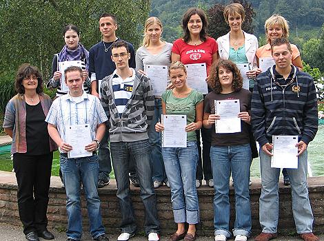 KMK Zertifikat Wirtschaftsenglisch wird weltweit anerkannt Es haben bestanden: Katja Karl, Angela Morr, Christina Mayer, Sandra Petri, Marco Allmann, Julia Rupp (hinten v.r.), Thomas Schätzle, Jasmin Landeck, Marina Bisert, Dominik Denk und Christian Schell mit ihrer Englischlehrerin Helga Maier (vorne v.r.). Nicht auf dem Bild Stephanie Tischler, die ebenfalls die Prüfung bestanden hat. (Foto: privat)(bro) (rd) Englischkenntnisse sind in der heutigen Zeit überall gefragt und können bei der Suche nach einer Arbeitsstelle den entscheidenden Vorteil bringen. Daher gibt es seit fünf Jahren an der TFS für Auszubildende zum Industriekaufmann/-kauffrau die Möglichkeit, im Rahmen des Erweiterungsunterrichts im Fach Wirtschaftsenglisch die berufsbezogene und praxisorientierte KMK Zertifikatsprüfung auf Stufe zwei abzulegen. Das Zertifikat ist in allen Bundesländern und auch weltweit anerkannt.