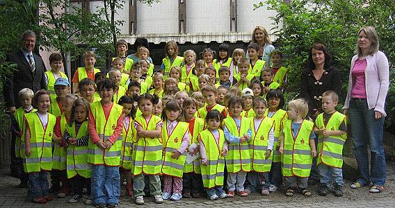 Mehr Sicherheit für Kinder im Straßenverkehr Sicherheitswesten für die Kinder im evangelischen Kindergarten Regenbogen - übergeben durch Regionaldirektor Karlheinz Emig. (Foto: privat) (bro) (hb) Kinder sind die schwächsten Verkehrsteilnehmer. Oft schätzen sie Gefahren falsch ein, begeben sich durch ihren Bewegungsdrang und spontanes Verhalten in unfallträchtige Situationen. Jedes Jahr verunglücken in Deutschland rund 1,6 Millionen Kinder, mehr als 464.000 von ihnen im Heim- und Freizeitbereich, viele davon im Straßenverkehr.