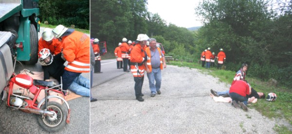 Gott sei Dank war alles nur eine Übung- aber alles sehr realitätsnah. Und wie so oft üblich rasten auch die Autofahrer und Motorradfahrer , teils mit überhöhter Geschwindigkeit, an der Unfallstelle vorbei. Oder gafften, ohne Erste Hilfe zu leisten, zu der sie im Ernstfall gesetzlich verpflichtet wären. Der Allemühler Feuerwehrkommandant Friedbert Heiß und Holger Winterbauer, Einsatzleiter des DRK Schönbrunn, hatten sich bei der Organisation der Übung eine realistische Unfallsituation vorgestellt, wie sie alltäglich passieren könnte. Ein mit Benzin beladener Gefahrguttransporter biegt von Moosbrunn kommend Richtung Eberbach ab. Auf Grund des engen Radius an der Kreuzung muss Lkw-Fahrer Manfred Heiß weit in die Gegenfahrbahn hinein fahren , damit er mit den hinteren Rädern nicht das Bankett streift. Aus Schönbrunn kommend brausen mit überhöhter Geschwindigkeit zwei Motorradfahrer heran und treffen in Höhe des Parkplatzes auf den Lkw. Das erste Motorrad kann dem Lkw noch ausweichen, fährt aber mit Fahrer und Sozius eine Böschung hinunter. Das zweite Motorrad kollidiert mit dem Lkw und beschädigt dabei die Außenhülle des Gefahrguttransporters. Ein Leck bildet sich und Flüssigkeit tröpfelt heraus. Der unter Schock stehende Lkw- Fahrer bremst sofort und alarmiert die Rettungsleitstelle. Als die Feuerwehren aus Allemühl und Moosbrunn eintreffen, wird nach der Absicherung der Unfallstelle zeitgleich der verletzte Motorradfahrer Mark Braner gerettet, der mit gebrochenem Unterarm und gebrochenem Oberschenkel direkt neben der Austrittstelle des Gefahrgutes liegt. Vorbildlich wird er vom DRK Schönbrunn medizinisch versorgt. Die Suche nach den beiden anderen Motorradfahrern gestaltet sich schwieriger, da sie an einem Steilhang die Böschung hinunter gefallen sind. Die Feuerwehr seilt sich professionell am Hang ab und findet nach einigen Minuten den schwer verletzten und bewegungsunfähigen Motorradfahrer Nicolas Erb und seinen bewußtlosen Sozius Yannik Berberich. Professionell werden auch diese beiden Verletzten gerettet und medizinisch versorgt. Nach sieben Minuten ist die Erstversorgung der Unfallopfer bereits sicher gestellt und nach fünfzehn Minuten ist die Übung bereits beendet.