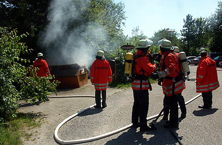 Brandursache vermutlich Reste von Grillkohle Recht schnell war der Containerbrand im Feriendorf Waldbrunn gelöscht. (Foto: Baumgartner)(tb) Per Sirenen wurden heute gegen 14.45 Uhr die Feuerwehren aus Strümpfelbrunn und Waldkatzenbach alarmiert und mussten ins Feriendorf Waldkatzenbach ausrücken. Dort war - wie schon so oft in den vergangenen Jahren - aus bisher noch unbekannter Ursache ein Müllcontainer in Brand geraten, welcher aber durch das schnelle Eingreifen der Feuerwehren recht schnell gelöscht werden konnte.
