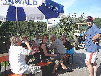 Hochsommerliche Temperaturen und ein kühles Bier (Foto:Gündling)(ag) In Friedrichsdorf wussten sich gestern bei hochsommerlichen Temperaturen die Daheimgebliebenen besonders gut zu helfen: Tische, Bänke und Sonnenschirme waren aufgrund der Wettervorhersage schon vor wenigen Tagen organisiert worden und bei einem kühlen Bier genoss man Urlaubsgefühl hausgemacht. – Unser Bild zeigt Ortsvorsteher Horst Weis mit Einwohnern aus dem Unterdorf und wie sich Odenwälder Gemütlichkeit gut leben lässt.