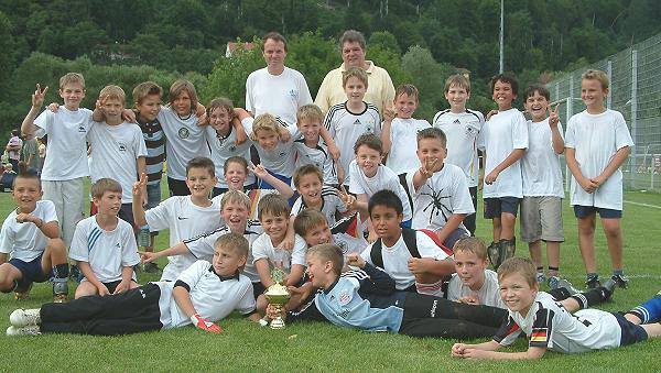 Kicker der Dr. Weiss-Schule holten dieses Jahr den Wanderpokal Die stolzen Sieger der 3. und 4. Klasse von der Dr. Weiss-Schule mit Coach Manfred König (hinten recht) und dem vom VfB gestifteten Wanderpokal der von VfB-Vorstand Joachim Scheible (links) überreicht wurde. (Foto:Wörner)(tw) Im Rahmen des VfB Sportfestes fand heute zum zweiten Mal das Fußballturnier der Eberbacher Grundschulen statt. Die Mannschaften aus den dritten und vierten Klassen der Dr. Weiss- Grundschule und der Steige Grundschule konnten jeweils zwei Spiele gewinnen. Am Ende entschied, wie schon im letzten Jahr das bessere Torverhältnis, aber der Wanderpokal ging diesmal an die Dr. Weiss-Schule.