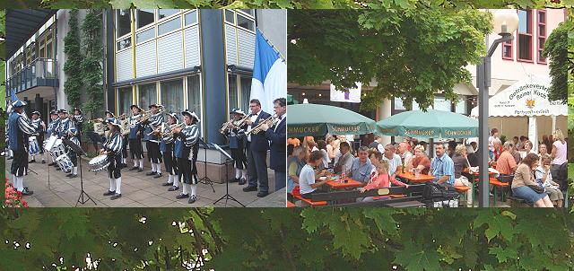 Miteinander auf dem Leopoldsplatz (Fotos:Gündling)(ag) Mit dem Fanfarenzug der Stadt Eberbach eröffnete in diesen Stunden das Evangelische Gemeindefest auf dem Leopoldsplatz. Dekanin Hiltrud Schneider-Cimbal begrüßte die zahlreichen Gäste und wünschte einen guten und schönen Abend des Miteinanders. Auch viele bekannte Eberbacher waren erscheinen, darunter auch Bürgermeister Bernhard Martin.