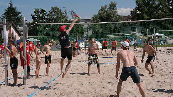 Indiaca-Team auf Deutschlands größtem Beach-Turnier (Foto: privat)(bro) (mr) Am vergangenen Wochenende machten sich die Eberbacher Indiaca-Spieler auf nach Karlsruhe zum größten Beach-Indiaca-Turnier Deutschlands. Neben 120 Mannschaften aus ganz Deutschland waren die Eberbacher mit zwei Männer- und zwei Mixed-Mannschaften 19+ vertreten. Am Samstag mussten sich zuerst die Männer-Teams ihren zahlreichen Gegnern stellen. Bei 38 Grad Celsius kamen die Spieler schnell auf Hochtouren, und der Kampf um die Punkte begann. Das regelmäßige Training seit April diesen Jahres machte sich bezahlt, und die "Neuen" konnten sich gegenüber ihren Gegnern sehr gut behaupten. Eine Männermannschaft verpasste den Einzug ins Achtelfinale nur knapp. Am Ende des Tages durften sich die Eberbacher über einen 20. Platz unter 45 teilnehmenden Mannschaften freuen. Nach einer kurzen Nacht in Zelten begann der Sonntagmorgen mit dem Mixed-Turnier. Hier waren 38 Mannschaften am Start. An diesem Tag überraschten die Eberbacher ihre Gegner durch ihr konzentriertes Spiel und ihre Ausdauer trotz Hitze und schafften den Einzug ins Achtelfinale. Hier standen sie dem Deutschen Meister im Hallen-Indiaca gegenüber. Im ersten Satz des Achtelfinales gegen den TSV Grünwinkel übertrafen sich die Eberbacher selbst und es gelang ihnen, ein Unentschieden zu erzielen. Hoch motiviert setzten sie ihr Spiel im zweiten Satz fort und konnten bis zum Schluss mit diesem Spitzengegner mithalten. Am Ende des Satzes konnten die Grünwinkler durch ihr langjähriges routiniertes Zusammenspiel das Ruder doch noch an sich reißen und gewannen den zweiten Satz mit drei Punkten Vorsprung. Somit verpasste das Eberbacher Team nur knapp das Viertelfinale. Am Ende landeten die Eberbacher auf dem 11. Platz. Hochzufrieden mit ihrer Leistung und ausgepowert traten sie nach der Siegerehrung die Heimreise an. Abschließend bleibt zu sagen, dass sich das Training sehr bezahlt gemacht hat, konnten sich die Eberbacher im Vergleich zum letzten Jahr gleich um zwanzig Plätze verbessern. Das große Ziel des Eberbacher-Indiaca-Teams für das kommende Jahr ist nun die Top ten zu knacken und bis ins Viertelfinale weiterzukommen.