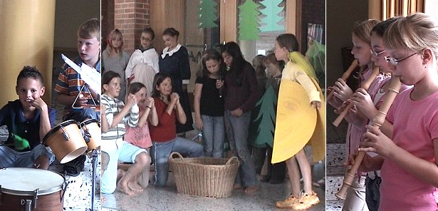 Grundschulkinder zeigten Mini-Musical (Fotos:C.Richter)(cr) Ein märchenhaftes Mini-Musical führten gestern etwa 40 Schülerinnen und Schüler der 2. bis 4. Klassen der Steige-Grundschule auf. Unter Leitung der beiden Lehrerinnen Heidrun Stumpf und Bärbel Weber spielten, musizierten und sangen die Kinder der Chor-, Orff- und Flöten-AG zum Märchen "Der dicke fette Pfannkuchen".