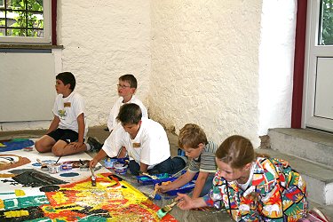 Ferienspaß-Malaktion in Galerie (Foto:privat)(jc) (uk) Einmal unverwundbar und mächtig sein, das wünschte sich ein kleiner Kreuzschnabel aus einer afrikanischen Geschichte, die sich Evelyn Dupke und Ute Koch vom FEX-Theater e.V. für die Ferien-Malaktion ausgesucht hatten. In den Räumen der Galerie ARTgerecht, wie immer von Juliane Kehm zur Verfügung gestellt, lauschten die jungen Künstler zuerst der Geschichte und konnten anschließend ihrer Fantasie freien Lauf lassen. Mit Pinseln und Farben wurde in Gemeinschaftsarbeit innerhalb von zwei Stunden ein großes Bild gemalt.