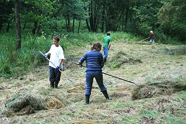 Arbeitseinsatz im Gammelsbachtal (Foto:privat)(jc) (cl) Seit vielen Jahren betreut die NABU-Gruppe Eberbach Wiesen und Wiesenbrachen im Gammelsbachtal. Am vergangenen Samstag haben sich Mitglieder des NABU und der NAJU-Jugendgruppe zu ihrem jährlichen Einsatz auf der so genannten Tümpelwiese eingefunden. Die Fläche war bereits ein paar Tage zuvor mit dem Balkenmäher gemäht worden. Nun musste noch das Mähgut mit Rechen und Gabel von Hand von der Fläche geräumt werden. Weiterhin wurde ein Bestand des Indischen Springkrauts beseitigt. Dank der besonders tatkräftigen Helfer waren die Arbeiten in diesem Jahr so schnell wie nie erledigt und es blieb auch noch Zeit für das ein oder andere "Späßchen" nebenbei.