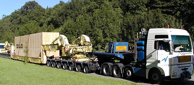 54 Meter langer Schwertransport rollt am Abend durch Eberbach Seit dem späten Nachmittag abfahrbereit auf dem Dilo-Werksgelände (Foto:Claussen)(jc) Heute gegen 22 Uhr startet ein 54 Meter langer Schwertransport der Maschinenfabrik Dilo in Richtung China. Ein 100 Tonnen schweres Sondermaschinenteil wird zunächst nach Heilbronn verbracht, und dort auf ein Binnenschiff verladen. Auf dem Weg dorthin wird der insgesamt 230 Tonnen schwere Transport im Stadtgebiet kurzzeitig Behinderungen verursachen.