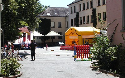 AWO- Ferientreff im Schulhof (Foto:Claussen)(jc) Riesen Spaß mit einer Titanic- Riesenrutsche, Hüpfburg, Piratenschiff und weiteren Attraktionen hatten gestern rund 60 Kinder beim AWO-Ferientreff im Schulhof der Dr.-Weiß-Schule. Günther Ihrig mit Gattin Inge von der Awo Eberbach und Mitarbeiter der AWO Rhein-Neckar betreuten die Kinder dabei. Neben dem ausgiebigen Toben standen auch kreative Basteleien auf dem Programm des "Spielmobils".