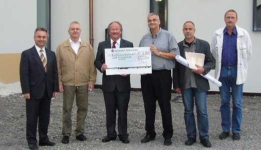 Insgesamt 7.500 Euro für den Wiederaufbau vl.:Bereichsleiter Franz Mainz, Pfarrgemeinderatsmitglied Werner Götzinger, Vorstandsvorsitzender Gerhard Stock, Pfarrer Karl-Michael Klotz, Baudirektor Wolf-Dieter Holzäpfel, Architekt Bertold Nohe.