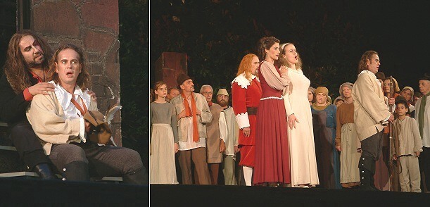 Traditionelle Inszenierung mit großartigen Solopartien Hinten Rainer Zaun als Kaspar mit Christian Voigt als Max. Jägerbursche Max(v.re.), mit Claudia Grundmann als Agathe, Anne Ellersiek als Ännchen und dahinter Hans-Josef Overmann als Fürst Ottokar, umrahmt vom Laienchor der Festspiele. (Fotos:Wörner)(tw) Am Freitag wurden zum 25. Mal die Zwingenberger Schlossfestspiele eröffnet. Im Jubiläumsjahr gab es zum Auftakt, wie sollte es anders sein, Carl Maria von Webers romantische Oper "Der Freischütz". Nach einer Spielzeit mit "Freischütz-Abstinenz" im vergangenen Jahr steht die "Hausoper" wieder auf dem Spielplan. Man hat sich, für die Aufführung im Jubiläumsjahr, zur Wiederaufnahme der Inszenierung aus dem Jahre 2005 entschlossen.