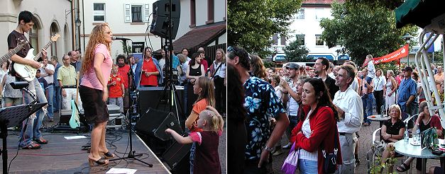Wetterglück und guter Besuch bei Renée Walker Band (Fotos:Claussen)(jc) Renée Walker und ein Wetterlichtblick in einem ansonsten kümmerlichen Sommer, lockte am Samstag hunderte Besucher auf dem Lindenplatz zum ersten von vier geplanten Open-Air Konzerten. Ein Andrang, der auch die Veranstalter "Eiscafé Venezia" und "Altes Badhaus" überraschte, bei deren Personal zeitweise die "Socken glühten". Sogar das Bier ging aus, es konnte aber rasch Nachschub beschafft werden. Die beiden Gastronomen, die zusammen mit der Sparkasse Neckartal-Odenwald und der Stadt Eberbach das Konzert ermöglichten, haben jedenfalls voll ins Schwarze getroffen, denn während bei der Vorgruppe "Zündstoff" der eine oder andere Besucher lieber noch eine "Cityrunde" einschob, war man von der Renée Walker Band fast ausnahmslos begeistert. Etwas schade war nur das frühe Ende gegen 22 Uhr.