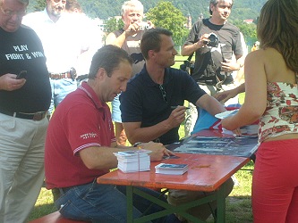 Adlerfreunde sammeln 1500 Euro für kranke Kinder Großer Andrang bei der Autogrammstunde von Greg Poss und Teal Fowler (Foto:M.Claussen)(jc) In sechs Jahren haben die Adlerfreunde Eberbach schon insgesamt 7000 Euro für krebskranke gesammelt. 1500 Euro davon steuerte der Fanclub am Wochenende hinzu. Mit einem Benefizfußballturnier, bei dem 14 Freizeitmannschaften antraten, einem Spiel der Traditionself des 1. FC Kaiserslautern gegen eine Ü40-Auswahl der Adlerfreunde und des SV 24 (11:3) sowie einer Autogrammstunde mit den Trainern der Mannheimer Adler, Greg Poss und Teal Fowler war ein interessantes Programm geboten. Nach viel Zuspruch im sportlichen Bereich wurden die Veranstalter am Abend von der Resonanz auf die angesetzte Open Air-Party enttäuscht. Lediglich 150 bis 200 Personen fanden den Weg zur Party in der Au. Hauptgrund dürfte die Parallelveranstaltung auf dem Lindenplatz gewesen sein, die den Rest der musik- und tanzbegeisterten Eberbacher schluckte. Trotzdem ist sich das engagierte Adler-Freunde-Team sicher im nächsten Jahr die 10.000-Schallmauer zu durchbrechen. Der Gesamterlös der Veranstaltung geht an die „Deutsche Leukämie-Forschungshilfe – Aktion für krebskranke Kinder“.