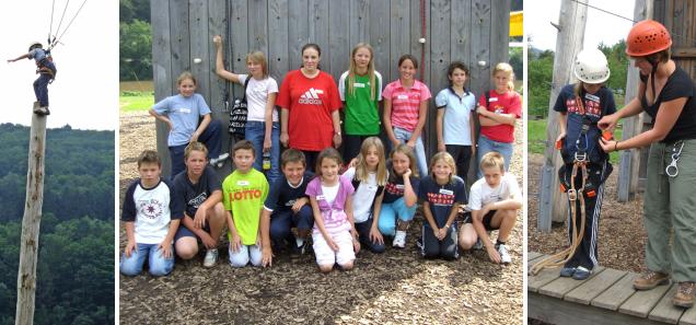 Kletterspaß im Hochseilgarten Neckargemünd (Fotos:privat)(jc) (sf) Am Sonntag Morgen startete im Rahmen des Eberbacher Ferienpaßprogramms eine Gruppe von 16 Kindern im Alter von 9-12 Jahren mit zwei Betreuern des TV Eberbach zum Hochseilgarten in Neckargemünd. Zu Beginn wurden erst einmal die allgemeinen Verhaltens-Regeln erklärt, dann zeigten die Teamleiter wie die Klettergurte und Helme anzulegen sind. Alle Kinder durften gemeinsam mit einem Partner die Gurte selbst anlegen, danach wurde das ganze natürlich noch einmal von den Profis überprüft. Nachdem in drei Gurppen aufgeteilt wurde, ging es auch schon los. Eine Gruppe startet an der achteinhalb Meter hohen Kletterwand. Immer durch das restliche Team und den Teamleiter gesichert durfte jeder mit eigener Kraft die Wand erklimmen. Auch bei den Flying Stepps war Teamwork gefragt. Die wackeligen Holzbretter, die nur in der Mitte an einem Seil hängen müssen von den unten stehenden Teammitgliedern stabilisiert werden, sodass derjenige der sich in sieben Metern Höhe von Step zu Step schwingen muss einen möglichst "sicheren" Stand hat. Die wohl größte Herausforderung bot der so genannte Pamper Pole. Hier galt es zunächst an einem frei stehenden siebeneinhalb Meter hohen Stamm hochzuklettern. Schritt für Schritt geht es der Pole-Spitze entgegen, dreifach gesichert durch die restliche Gruppe am Boden. Je höher man klettert, desto wackeliger wird es. Das Schwierigste ist der letzte Schritt, bis man frei auf dem Balken steht. Jetzt muss man sich noch um 180° drehen und dann einen Schritt/Sprung ins Leere wagen. Zum Abschluss durften alle noch an den Giant Swing. Bei dieser "Riesenschaukel" wird man mit seinem Gurt in ein Seil eingehängt, dann muss der Rest der Gruppe über ein spezielles Umlenksystem die im seil hängende Person nach oben ziehen. Durch eine Selbstsicherung kann sich dieser dann am höchsten Punkt selbst lösen und mit etwa 70km/h durch die Lüfte schwingen.