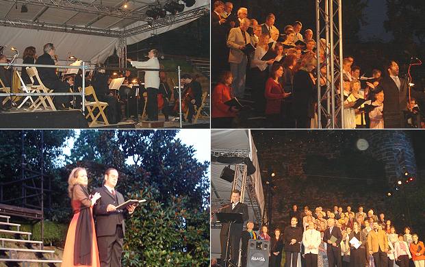 Eine Nachtzeit voller Rosen der Musik Dirigent Karsten Huschke mit dem hoch disponierten Orchester der Schlossfestspiele Zwingenberg; Claudia Grundmann (Sopran) und Christian Voigt (Tenor) beim Gesangsrezitativ (links); der Chor der Zwingenberger mit Mario Klein, der mit seiner Bassstimme wieder das Publikum in Bann schlug; Landrat Dr. Achim Brötel bei der abschließenden Würdigung (Fotos:Gündling)(ag) Stunden, die man nicht so schnell vergisst, denen man einen Strauß voller Melodien gebunden hatte, in welchen es Rosen regnete, die mit Feuerwerk und Festlichkeit endeten, aber in welchen man auch den Intendanten Friedemann Eichhorn verabschiedete, alles das umfasste das ausverkaufte Jubiläumskonzert auf dem Zwingenberger Schlosshof gestern zur Nachtzeit.