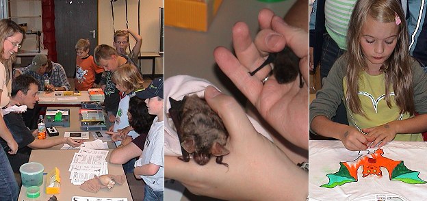 So auch in Eberbach, wo aus terminlichen Gründen bereits gestern die "Batnight" im Rahmen des Eberbacher Ferienprogramms stattfand. Insgesamt zehn Mitarbeiterinnen und Mitarbeiter der NAJU und des NABU Eberbach waren im Einsatz um fast 50 Kinder und einige Erwachsene umfassend über die Fledermausarten und deren Lebensgewohnheiten zu informieren. Es wurden Fledermaus-T-Shirts bemalt, gebastelt und gespielt. In einem Lesezimmer konnten die Besucher Geschichten über die kleinen Tiere hören. Ein kindgerechtes Fledermausvideo klärte so manche Frage, und auch echte Fledermäuse durften bestaunt und gestreichelt werden. Martina und Ralf Hausemann betreuen zwei Dauerpfleglinge - eine Zwergfledermaus und ein Großes Mausohr -, die nicht mehr flugfähig sind und somit in freier Natur keine Überlebenschance hätten. Beide Tiere sind Menschen gewohnt und konnten deshalb auch gestern Abend in der Steige-Grundschule als Hauptattraktion mit dabei sein.
