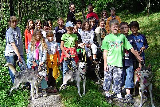 Kinder absolvierten Husky-Führer-Schein (Foto: privat)(bro) (am) Christof Diehl und Angelika Merkel boten dieses Jahr nunmehr in siebter Auflage das bewährte Husky-Streichel-Programm im Lindacher Zwinger an. 19 Kinder wurden nach Alter in zwei Gruppen aufgeteilt. Dank der Hilfe der langjährigen Helfer Ann-Kathrin und Jürgen Schmitt konnte jede Gruppe von zwei Betreuern unterstützt werden. Beide Teams bekamen mehrere Hunde zugeteilt, die sie für diesen Tag versorgen mussten. Nach einer allgemeinen Einführung bekamen die Hunde etwas zu trinken. Dem Wasser wird dabei eine kleine Menge Trockenfutter zugesetzt, damit die Hunde die ihnen zugedachte Menge gerne aufnehmen. Für Training und Rennen ist es wichtig, dass die Wasserspeicher vor der Belastung gut gefüllt sind, das gilt genauso für Spaziergänge an heißen Tagen. Dann wurde das Anziehen des Zuggeschirres geübt. Der Husky als Schlittenhund soll schließlich ziehen, was am Halsband für ihn unangenehm wäre. Deswegen gibt es spezielle Zuggeschirre, die die Kraft optimal auf die Leine übertragen. Bis die Hunde ihr Wasser verdaut hatten, konnten die Kinder sich selbst ein Bild von deren Leistung beim Training und Rennen machen. Da es für die Huskies noch zu warm war (sie werden erst ab 15 Grad Celsius trainiert) wurden die Kinder vor das Trainingsgefährt, einen Kawasaki-Allrad-Quad, gespannt und konnten am eigenen Körper erfahren, was die Huskies ziehen können. Danach gingen die Gruppen mit den Hunden spazieren. Die größte Überraschung war vermutlich, dass ein ziehender Husky zwar bergauf eine tolle Sache ist, bergab aber ziemlich anstrengend. Die zuerst zurückgekommene Gruppe bürstete noch die Hunde. Im Winter bauen die Huskies sehr dichte Unterwolle auf, die sie im Frühjahr/Sommer komplett abstoßen. Das Sommerfell ist nicht wärmer als z.B. von einem Schäferhund. Deswegen können sie auch in unseren Breiten ohne Probleme gehalten werden. Als alle wieder da waren, gab es zunächst einen stärkenden Imbiss. Dann war Denken beim Husky-Quiz angesagt. Die Kinder bewiesen, dass sie den Tag über gut aufgepasst hatten und beantworteten fast alle Fragen richtig. Sie hatten damit den "Husky-Führer-Schein" bestanden. Die Urkunden können in der Bahnhof-Apotheke abgeholt werden. Wer Lust hatte, konnte dann noch einmal in den Auslauf, um die Junghunde zu streicheln. Als die Kinder von den Eltern abgeholt wurden, waren sich alle einig – nächstes Jahr kommen sie wieder.