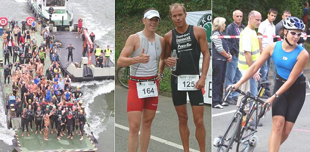 Zweiter und dritter Platz für Florian Uhrig und Judith Bohnert vom Tri-Team Eberbach Die Starter auf dem Weg zum Kanuhaus, der Erst- und Zweitplatzierte Hendrik Becker (r.) und Florian Uhrig nach dem Zieleinlauf und Judith Bohnert am Ende der Radstrecke. (Fotos:DLRG/Wörner)(tw) Heute um 9 Uhr fiel der Startschuss für 166 Einzelathleten und die Schwimmer der 25 teilnehmenden Mannschaften zum 14. Eberbacher Jedermann- und Sprinttriathlon. Bei 19 Grad Wassertemperatur ging es beim Kanuhaus auf die Schwimmstrecke von 700 Metern bis zur DLRG Station. Vor dem Schwimmbad warteten einige Hundert Zuschauer, die die Athleten gebührend begrüßten und beim Wechsel auf die Räder anfeuerten. Für die anstehende Radstrecke waren die Temperaturen heute nahezu ideal. Über Pleutersbach ging es nach Allemühl, Schönbrunn und Schwanheim zum Wendpunkt und von dort aus wieder zurück, insgesamt eine Strecke von 21 Kilometern. Beim Wechselpunkt am Schwimmbad wurden dann wieder unter reger Anteilnahme der zahlreichen Zuschauer die Fahrräder gegen Laufschuhe getauscht. Für die Einzelathleten und die Läufer der Staffelmannschaften ging es auf die abschließende Laufstrecke über sechs Kilometer nach Pleutersbach und zurück. Bei den Männern konnte der Eberbacher Florian Uhrig den zweiten Platz belegen und dabei seine Vorjahreszeit etwas verbessern. Bei den Frauen konnte die Eberbacher Athletin Judith Bohnert den dritten Platz erreichen. Bei den Mannschaften siegte die Staffel des VFR Waldkatzenbach mit Phillip Uhrig, Sebastian Weiss und Michael Rauk.
