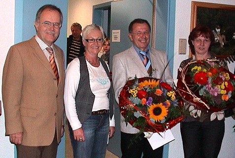 Unser Bild zeigt Egon Scheuermann (2.v.r.) mit Ehefrau Heidrun (r.) sowie Mechthild Krall von der Fraktion GFW/ÜWS in der Gemeindevertretung und Noch-Bürgermeister Manfred Heiss, der heute als Wahlleiter fungierte.