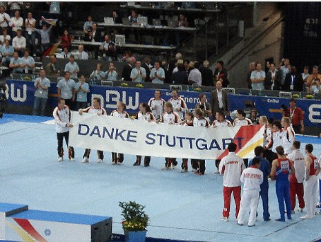 Goldenes Finale wird zum unvergesslichen Erlebnis Die deutsche Nationalmannschaft bedankte sich beim Publikum nach dem Ende der Wettkämpfe. (Foto: privat)(bro) (lw/md) Beim Besuch der Turnweltmeisterschaft in Stuttgart am 9. September erlebte die Turnabteilung des TV Eberbach in einer tollen Atmosphäre, wie Fabian Hambüchen Reckweltmeister wurde. Eröffnet wurde mit dem Sprungfinale der Herren, in dem Fabian Hambüchen den 6. Platz erreichte. Nach den Finalwettkämpfen am Balken, Barren und Boden, bei denen man spektakuläre und faszinierende Übungen sehen konnte, kam der Höhepunkt des Tages: das Reckfinale der Herren. Unter tosendem Applaus des begeisterten Publikums sicherte sich Fabian Hambüchen nach spannenden 20 Minuten den Weltmeistertitel. Als die Eberbacher die Halle verließen, konnten sie noch ein paar Blicke aus nächster Nähe auf das deutsche Turnteam werfen.