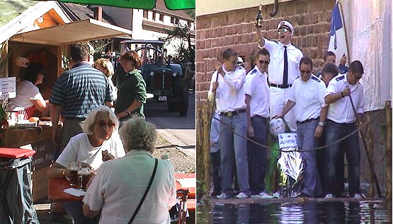Straßenkerwe in Pleutersbach (Fotos:Richter)(hr) Mit dem Fassanstich durch Bürgermeister Bernhard Martin wurde heute Nachmittag die traditionelle Pleutersbacher Straßenkerwe eröffnet. Zuvor waren die Kerweborscht auf einem Holzfloß mitsamt Kerweschlumpel "Arielle" ein Stück den aufgestauten Pleutersbach hinabgefahren (unser BIld rechts). Mit an Bord waren auch Bernhard Martin und Ortsvorsteher Harald Rupp.