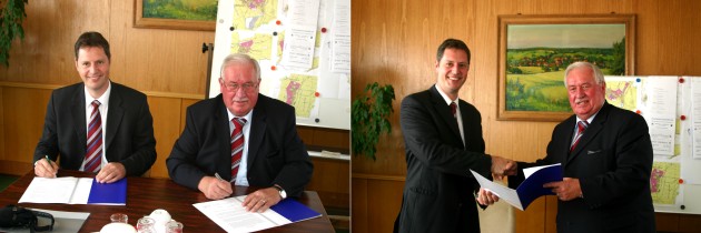 Seit Februar beschäftigt sich der Schönbrunner Gemeinderat mit dem vorzeitigen Abschluss eines neuen Konzessionsvertrages, der auf einem Musterkonzessionsvertrag basiert (wir berichteten) und für die Gemeinde Schönbrunn einen zehnprozentigen Preisnachlass gegenüber dem alten Vertrag beinhaltet. Nachdem die Gemeinderäte im Juli dem neuen Vertrag einstimmig zugestimmt haben, brachte EnBW- Kommunalbetreuer Steffen Holeijko zwei Vertragsausfertigungen mit in den kleinen Sitzungssaal des Schönbrunner Rathauses, wo einer Vertragsunterzeichnung durch EnBW- Regionalleiter Kai Fischer und Bürgermeister Roland Schilling nichts mehr im Wege stand. Mit der Vertragsunterzeichnung wurde nun der seit 1991 bestehende Vertrag vorzeitig zum 31. März 2009 aufgelöst und ab dem 1. April 2009 ein neuer Vertrag mit einer Laufzeit von 20 Jahren abgeschlossen.