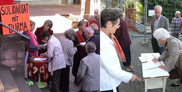 Solidarität mit den Demonstranten in Burma (Fotos:Richter/Nolten-Casado)(cr) Auch in Eberbach gibt es Solidarität mit den friedlichen Protesten in Burma. Die Eberbacher "Arbeitsgemeinschaft für interkulturelle Frauenbegegnung" organisierte spontan eine Unterschriftenaktion. Gestern wurden vor der katholischen und der evangelischen Kirche Infostände aufgebaut und ein Schreiben an die burmesische Botschaft zur Unterschrift ausgelegt, in dem die friedlichen Demonstranten unterstützt und die Militärregierung zum Gewaltverzicht, zur Freilassung politischer Gefangener, zu Dialog und Versöhnung aufgefordert werden. Insgesamt gut 250 Unterschriften wurden gestern gesammelt.