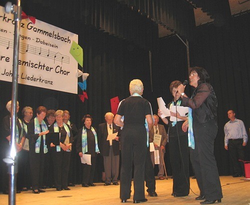 Frauen nun ein Vierteljahrhundert dabei Die Vereinsvorsitzende Ingrid Reinschild ehrt Frauen, die im gemischten Chor von Anfang an aktiv dabei sind. (Foto:privat)(tw) (lg)Zahlreiche Chöre aus der Region, sowie Vertreter aus Politik und Vereinsleben besuchten das zweitägige Jubiläumsfest des Liederkranz Gammelsbach am vergangenen Wochenende. Zu seinem 25-jährigen Bestehen durfte sich der gemischte Chor über Gratulationen in Worten, Liedern und Tänzen freuen.